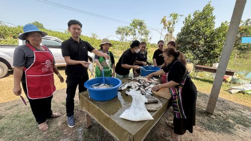 นอกจากนี้ ยังมีการส่งเสริมองค์ความรู้ด้านการพัฒนาช่องทางการตลาดและการประชาสัมพันธ์ การจัดทำแผนปฏิบัติการของกลุ่ม รวมถึงการสาธิตอาชีพด้านการแปรรูปอาหาร ซึ่งสอดคล้องกับศักยภาพของชุมชน โดยสามารถจัดตั้งกลุ่มอาชีพได้อย่างเป็นรูปธรรม ภายใต้ชื่อ “กลุ่มสัมมาชีพชุมชนบ้านหินโงมเหนือ“ซึ่งมุ่งเน้นการใช้วัตถุดิบในพื้นที่ คือ ปลานิลกระชังแม่น้ำโขง และปลาตะเพียน จากแปลงโคกหนองนา นำมาแปรรูป เป็นเมนูอาชีพ ปลาแดดเดียว ปลาส้ม เพื่อสร้างรายได้เสริม เพิ่มมูลค่าผลิตภัณฑ์ และยกระดับคุณภาพชีวิตของครัวเรือนในชุมชน